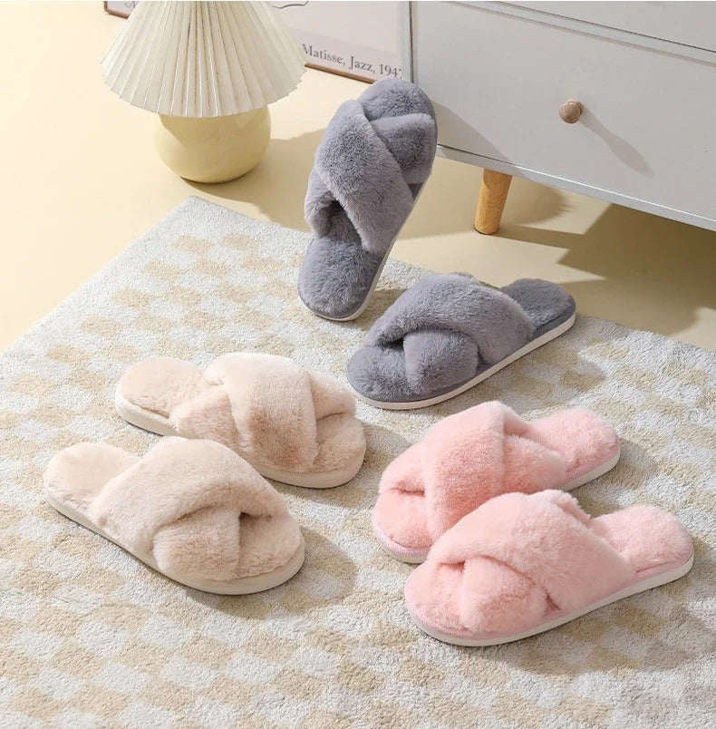 Ontdek de ultieme mix van comfort en stijl met onze Casual indoorpantoffels voor dames. Deze slippers zijn perfect om in huis te luieren en hebben een pluche, pluizig kruisontwerp dat je voeten in luxe wiegt.