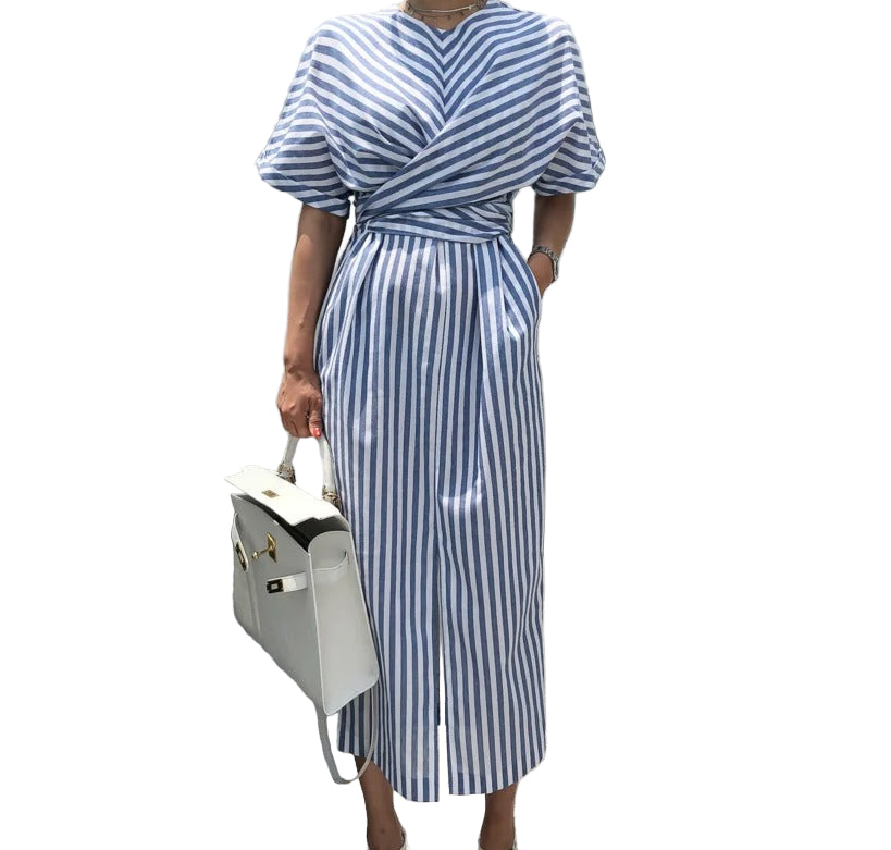 TIJDLOOS ELEGANTIE: Verhoog je zomerstijl met de klassieke allure van onze Gestreepte Bandagejurk. Het tijdloze gestreepte patroon straalt verfijning uit en zorgt ervoor dat je overal een statement maakt.
