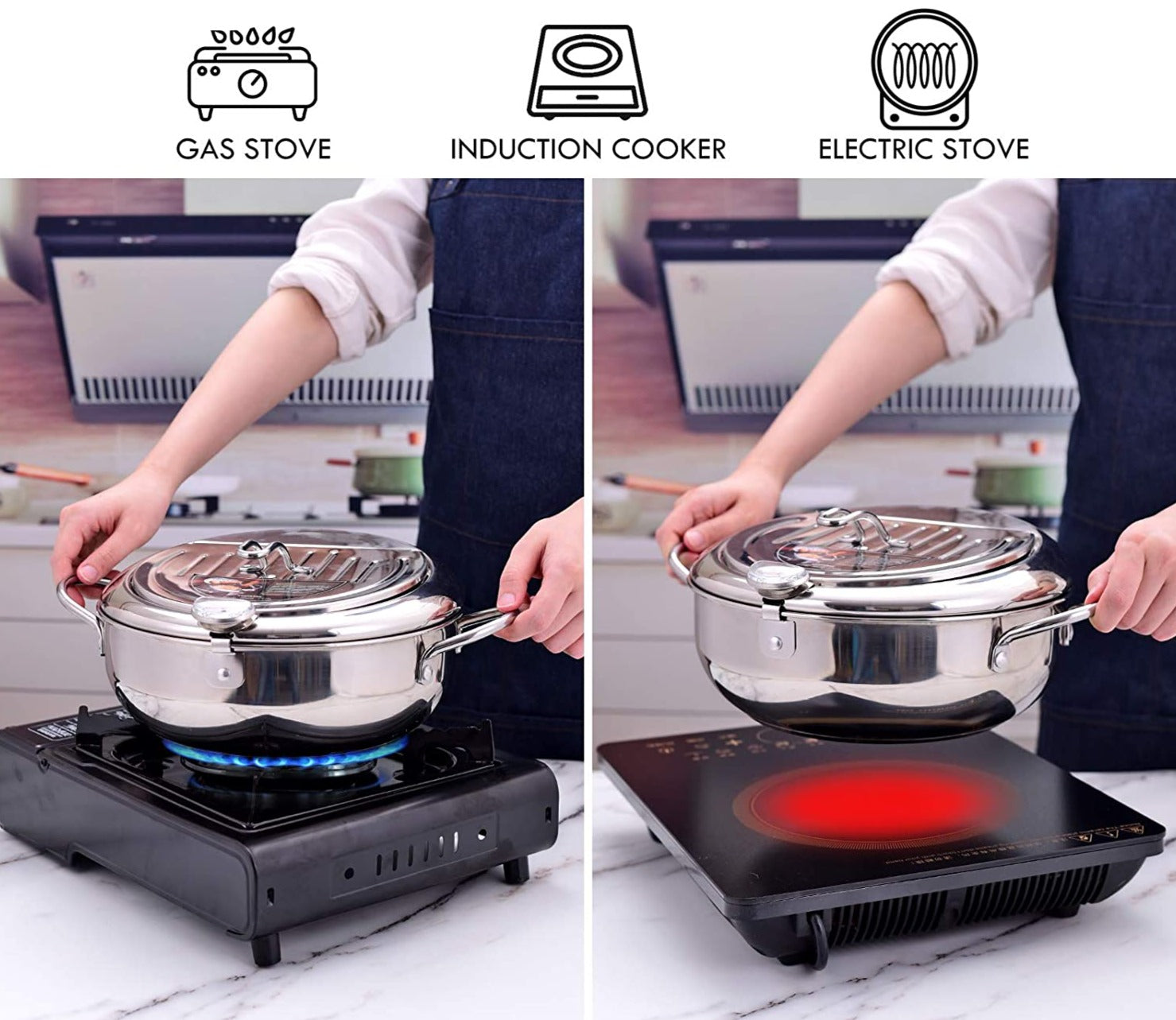 De roestvrijstalen frituurpan is klein maar ruim genoeg om al je voedsel in één keer te frituren. De Frituurpan kan worden gebruikt op elk fornuis, zoals elektrisch, gas, inductie en infrarood.